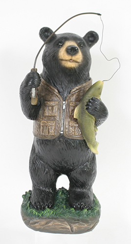 Resin bear with metal fishing rod figure measures 6"L x 5.5"W x 15.5"H